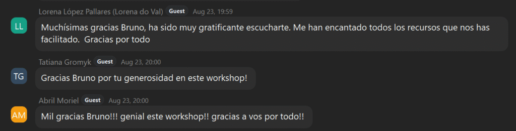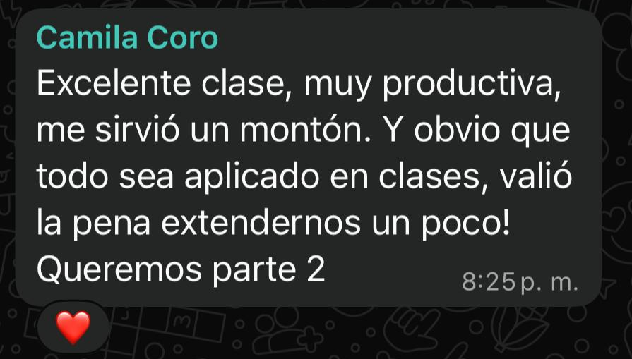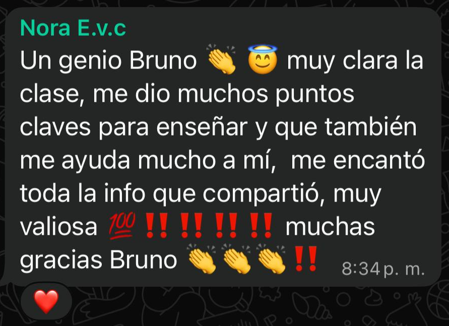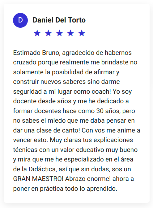 "Bruno, quería decirte que me pareció excelente tu curso para profesores de canto. Das ejemplos directos y concretos sobre temas realmente complicados. Más allá de que había información que ya conocía (ya que hace 10 años que doy clases), el capítulo de las consonantes y cómo combinarlas con vocales me sirvió un montón, ya que lo fui aplicando con mis alumnos y, en la mayoría de los casos, me trajo soluciones inmediatas. Se nota tu pasión por la docencia y te felicito y admiro por la capacidad que tienes para ser tan puntilloso con cada detalle."